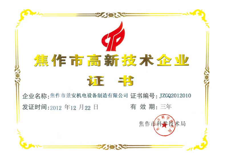 焦作市高新技术企业证书