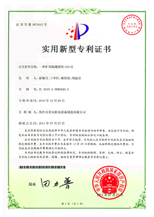 矿用LED隔爆型巷道圆灯专利证书