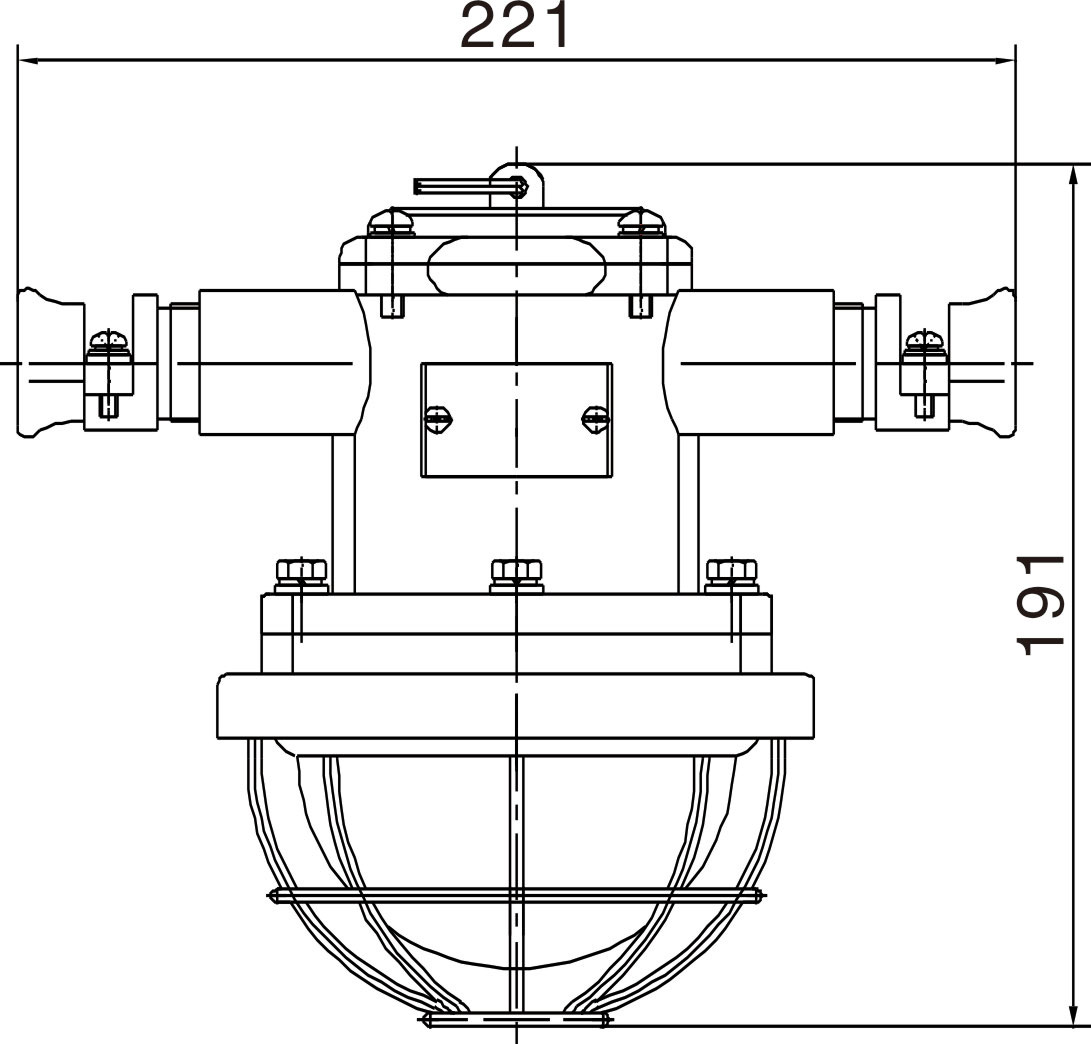 LED灯由上盖、上壳体、下壳体、防爆透明玻璃罩、护罩等组成,上盖与上壳体用M4螺钉连接,下壳体用M6螺钉与上壳体相连。防爆透明玻璃罩、护罩用M4螺钉固定在下壳体上。上壳体外有M4外接地螺钉、铭牌等。上壳体内有接线板、M4内接地螺钉、LED驱动电源板。下壳体内有密封垫、防爆透明玻璃罩、LED光源、散热板。散热板通过上壳体将光源热量散发到灯体外。上盖、上壳体、下壳体、防爆透明玻璃罩之间均有符合规定的隔爆接合面隔爆。